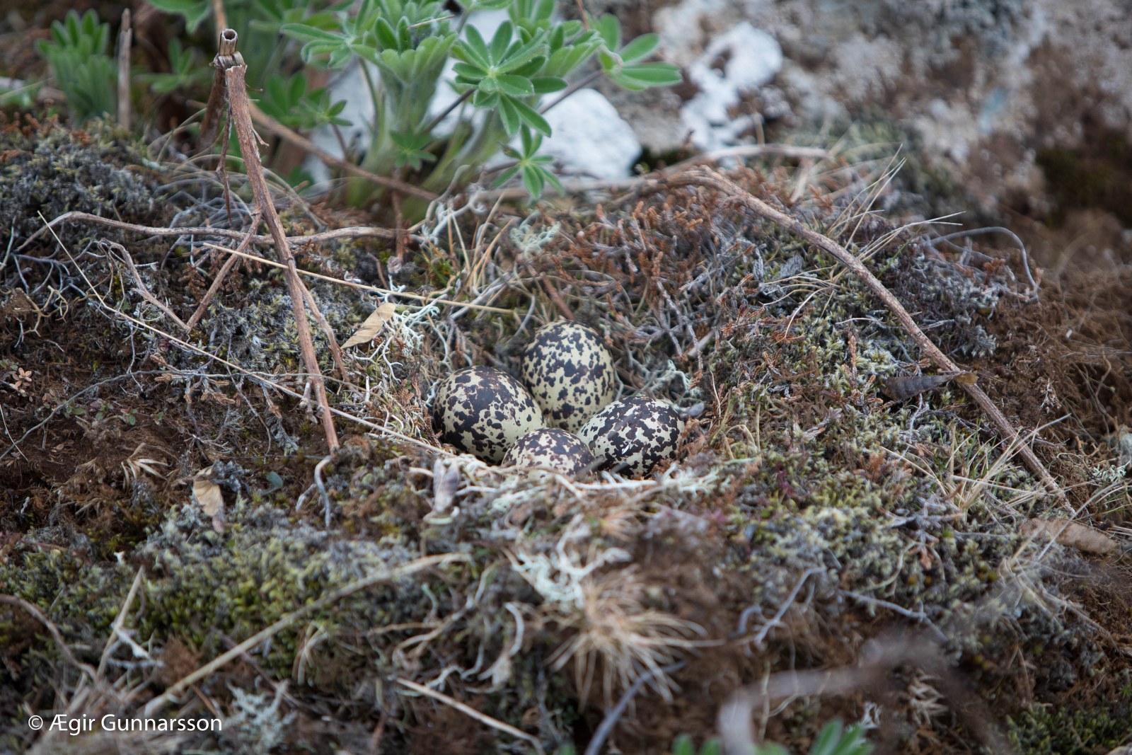 Ég fór í göngutúr í hrauninu á Reykjanesi og gekk þar fram á heiðlóuhreiður. Ég smellti nokkrum myndum af því og hélt svo áfram göngunni til að trufla lóurnar ekki meira. Heiðlóur verpa venjulega 4 eggjum, bæði kk og kvk skiptast á að liggja á eggjunum í um það bil 27-31 daga þangað til ungarnir klekjast úr þeim.