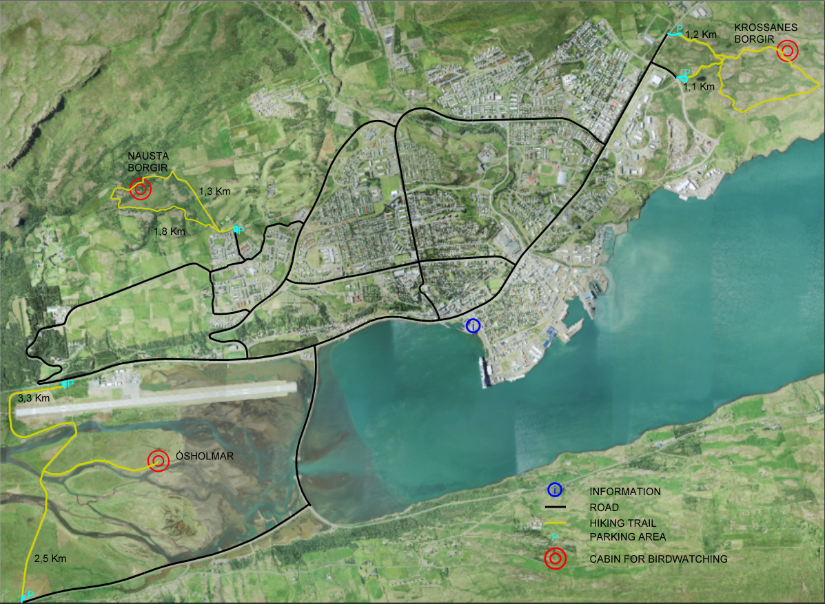 Yfirlitsmynd af fuglategundum við Naustaborgir. Yfirlitsmynd af fuglaskoðunarhúsum á Akureyri.